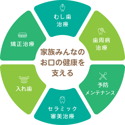 むし歯や歯周病といった一般的な治療から、矯正やセラミック治療まで幅広く対応しています。多くの患者さまに繰り返し通っていただいている点も、地域に根差した診療の証です。ちょっとした違和感や相談しにくいお悩みも含め、気軽に頼れる存在として、家族みんなのお口の健康を支えています。